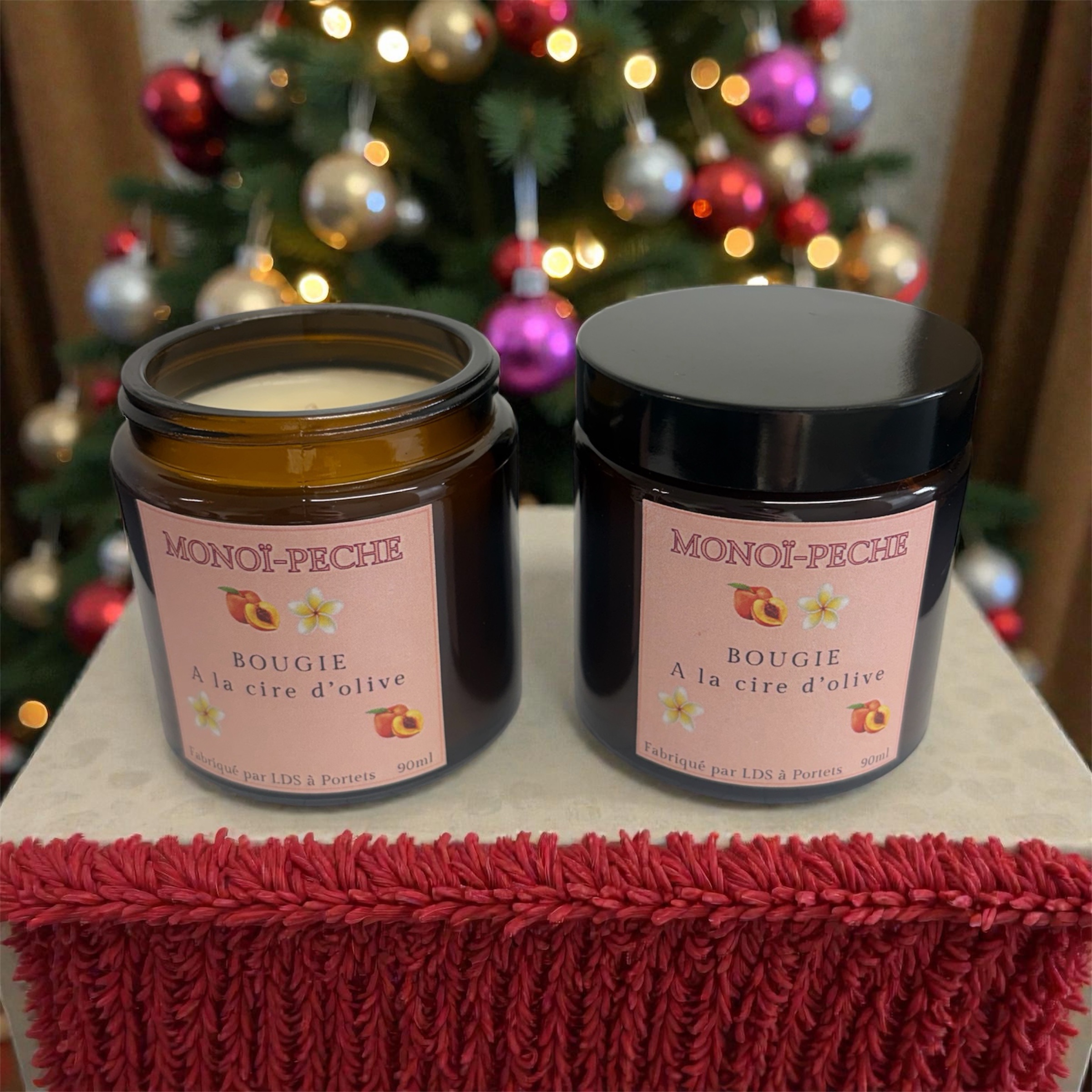 Bougie parfumée Pêche-Monoï, 90ml. La senteur best seller de la boutique.